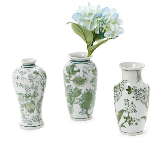 PRIMROSE AND LOTUS HAND-PAINTED GREEN AND WHITE CHINOISERIE VASES-Set of three