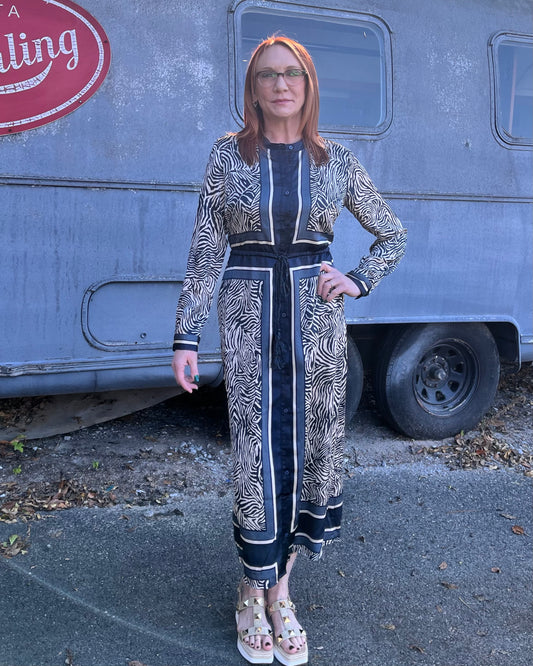 Drawstring Shirt Dress-Navy Multi