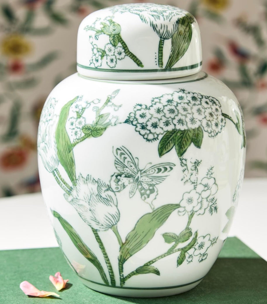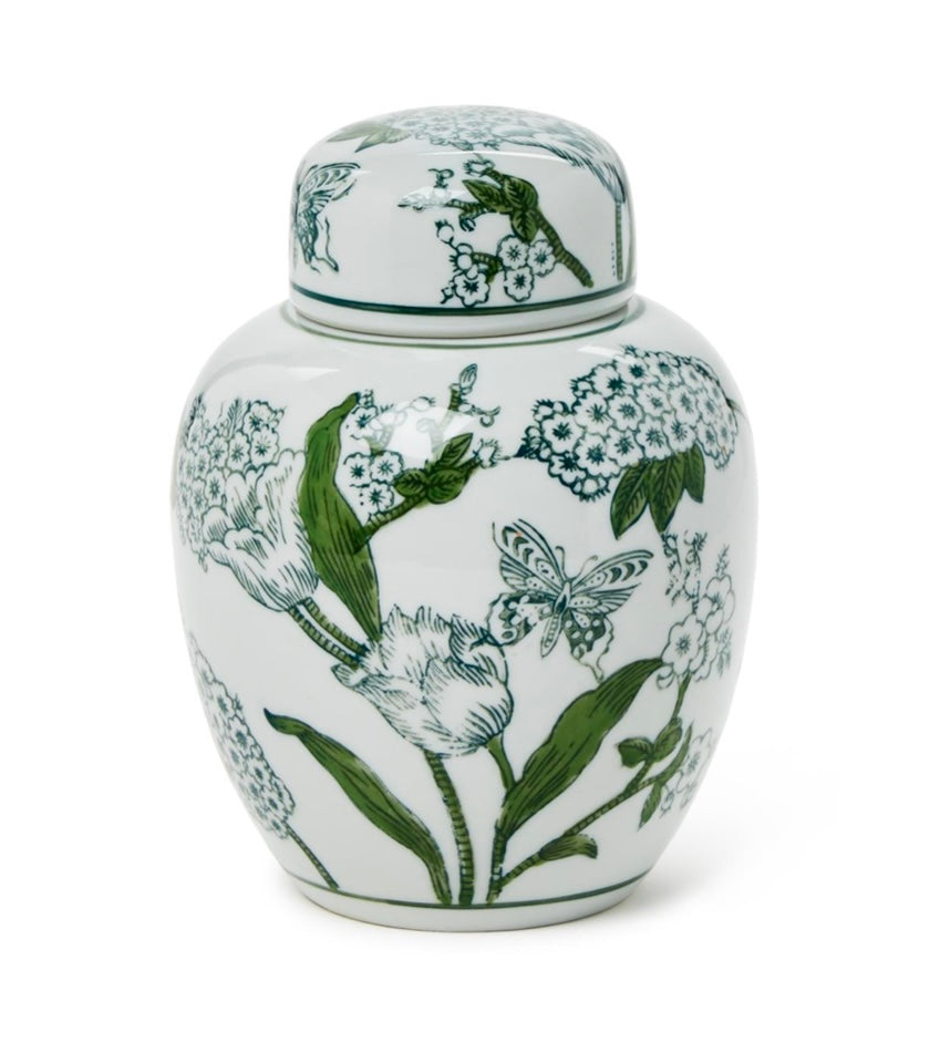 7 1/2" PRIMROSE AND LOTUS GREEN AND WHITE CHINOISERIE GINGER JAR WITH LID