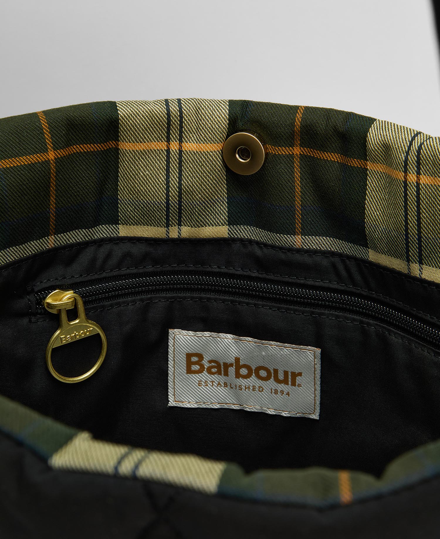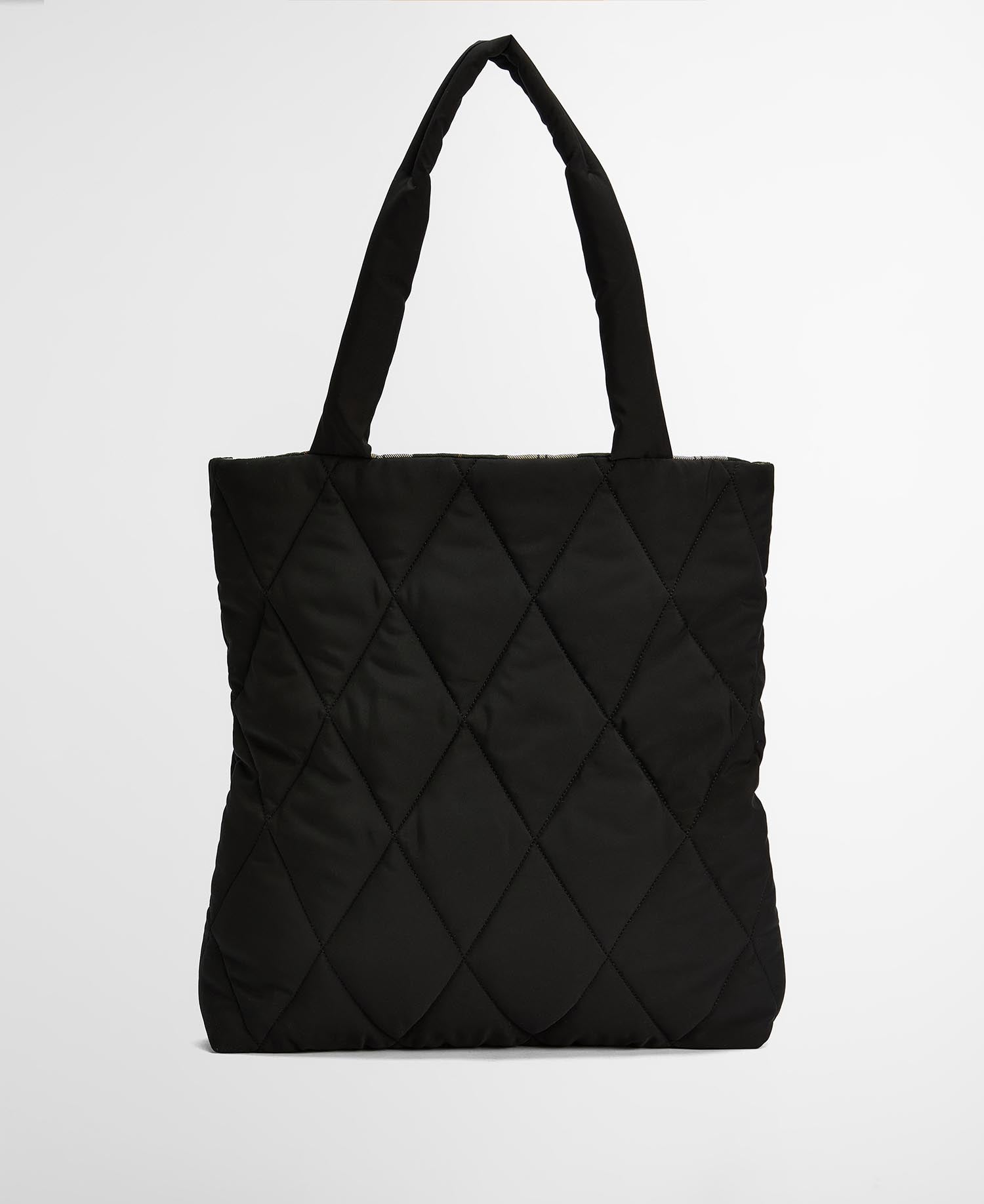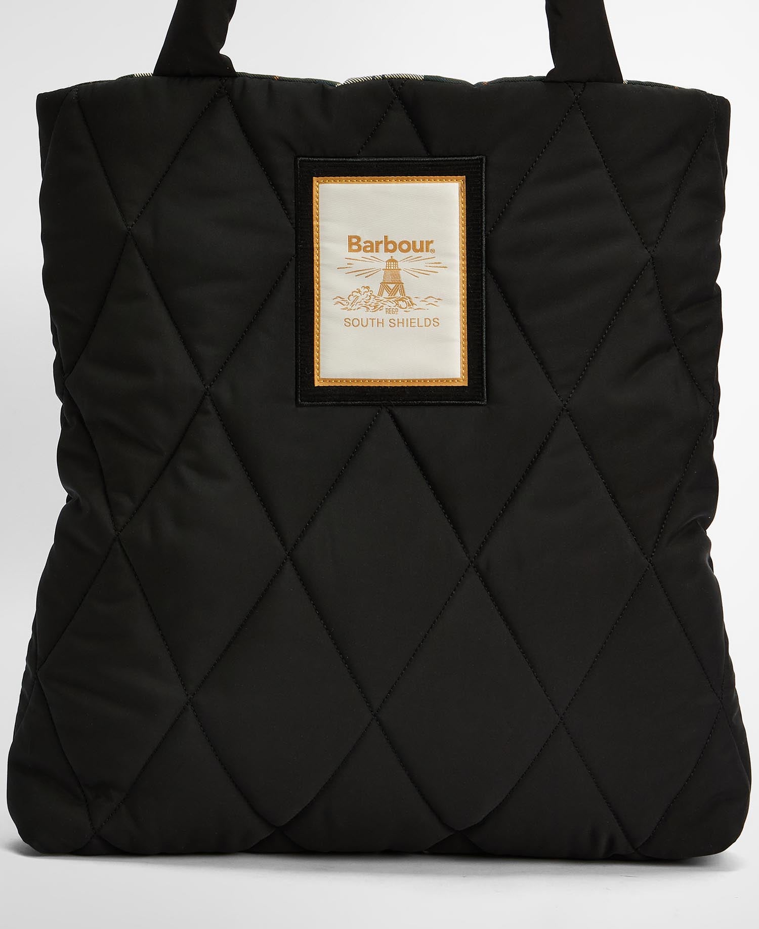 A signature logo patch stands out against the diamond-quilted exterior of a spacious tote perfect for storing your daily essentials.