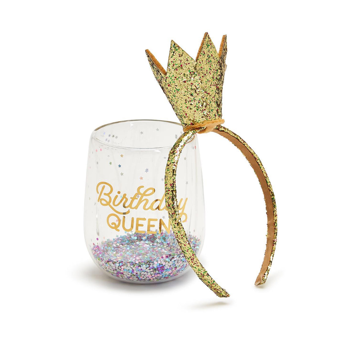 Bring the party to the birthday queen. Unique stemless wine glass packed with multi-color confetti glitter. Give it a good shake and the glitter will stay up. The gold crown will truly make that special someone look like a queen.