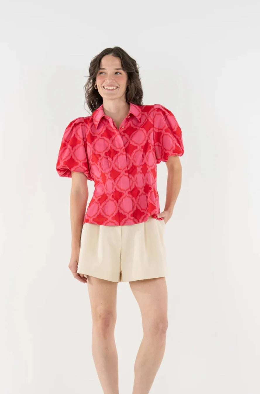 The Britt Top in Villa blends tailored structure with romantic volume, featuring a classic fold collar, softly puffed sleeves, and a lightly boned bodice that creates a flattering, sculpted shape. A subtle peplum hem adds gentle movement while maintaining a clean, structured look. Fabricated in the Villa jacquard print—a textured, feminine pattern inspired by the mosaic tilework of Jaipur—this top feels tasteful yet expressive, offering a statement silhouette designed for elevated everyday moments and beyond