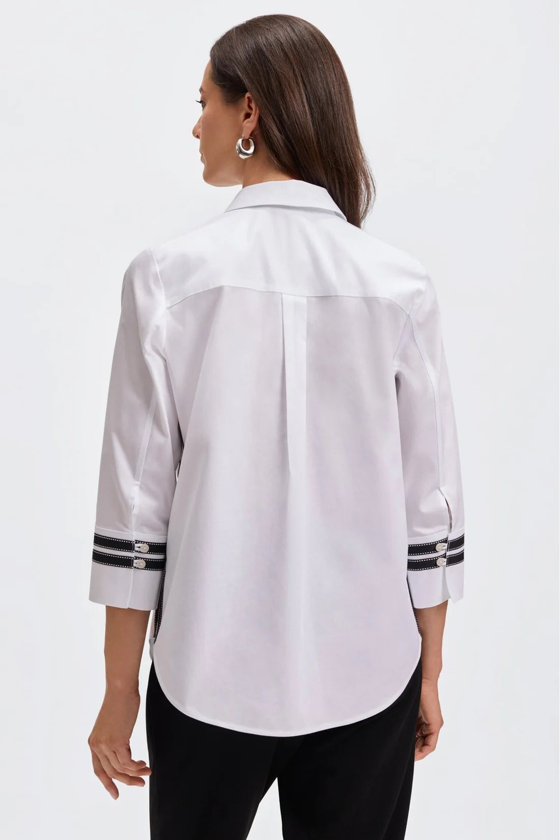 A classic shirt with a modern twist. We designed Brooke to include all the hallmarks of our signature silhouettes — a beautifully concealed placket for a streamlined look, a crisp point collar, and a relaxed, flowy drape that flatters and moves with you. Then we added the finishing touch: grosgrain accents along the cuffs and side seams for a nod to craftsmanship and detail. The white shirt shows off high-contrast black grosgrain, while soft aqua, pistachio, and pink sea glass have dyed-to-match grosgrain with meticulous white stitching.