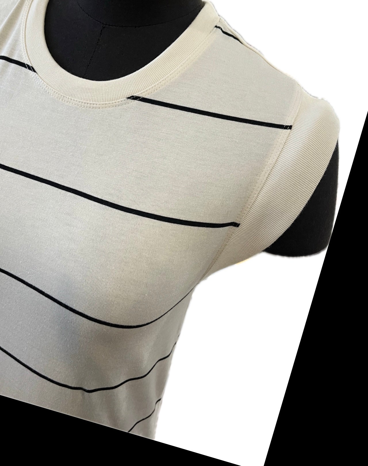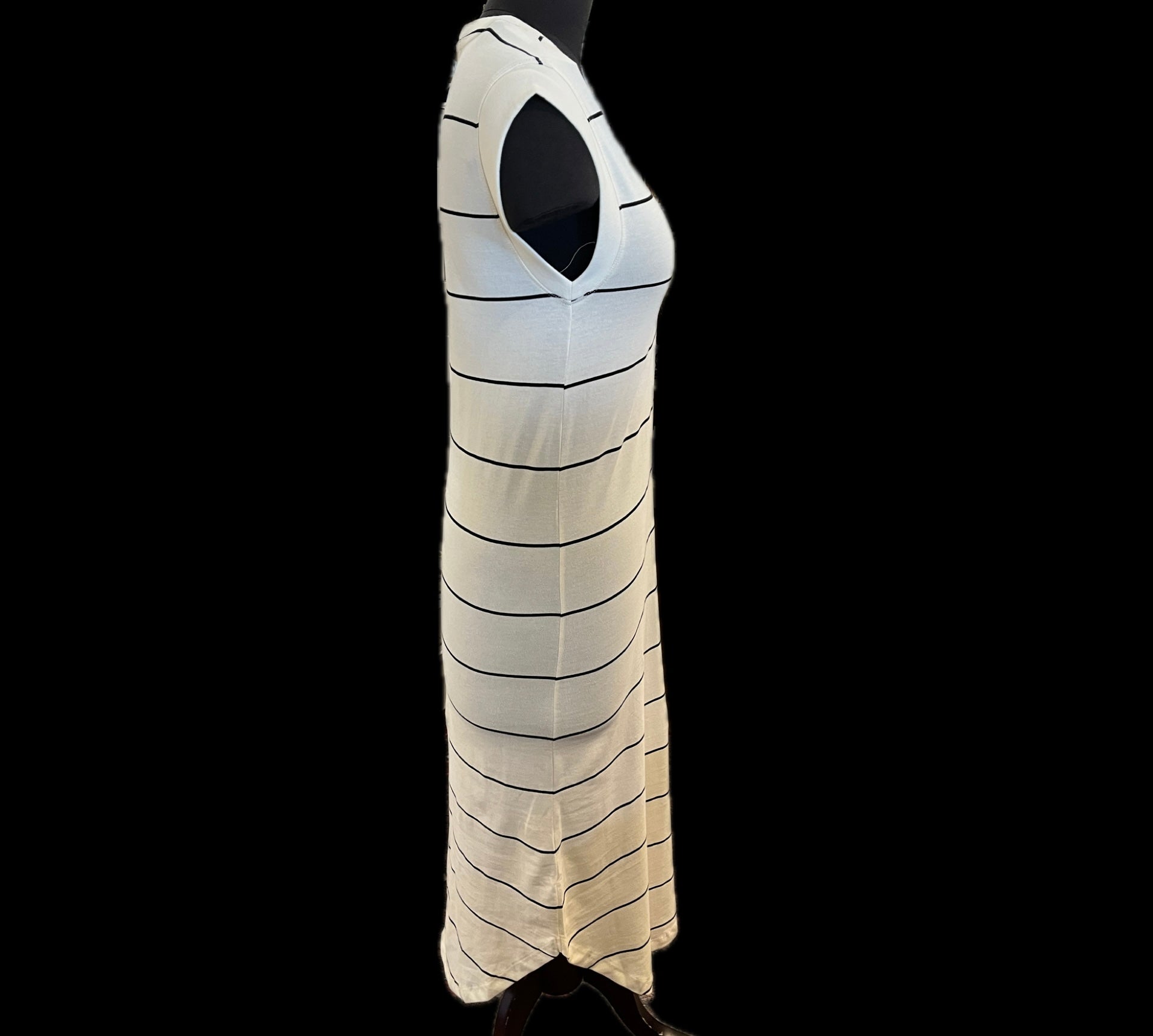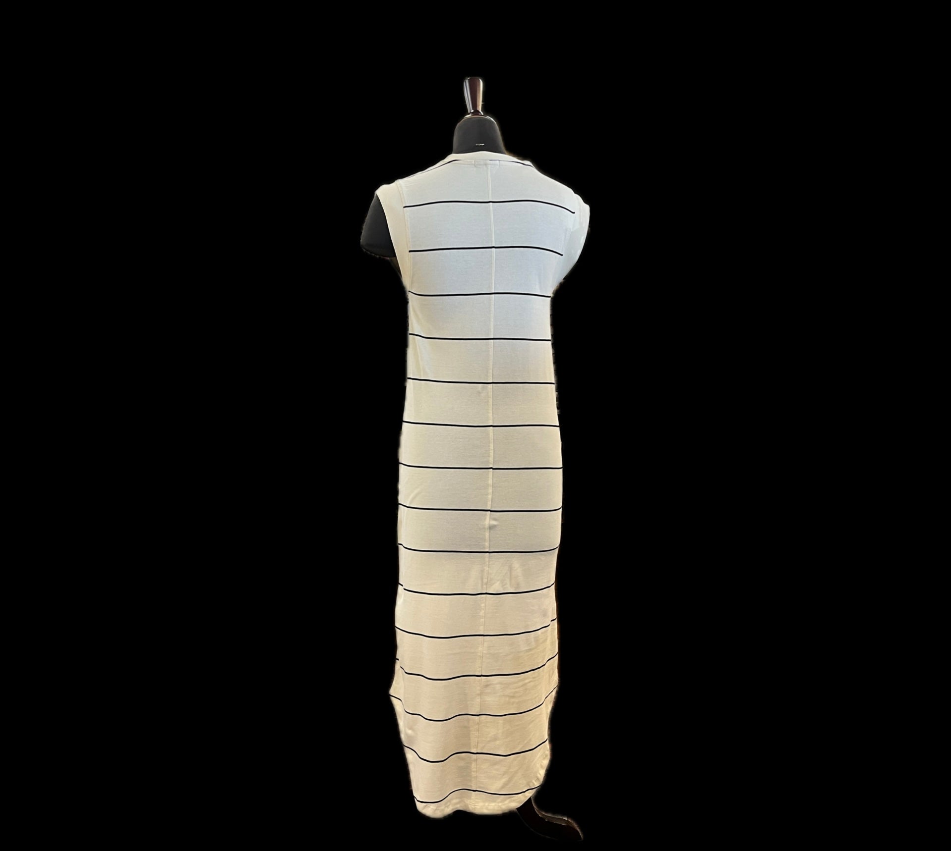 This lightweight midi dress by Z-Supply is perfect for any occasion! From casual wear to vacation or an event, this dress is perfect. It has thin black stripes on an off-white background, short sleeves, and a crew neck. In the color “Crystal” and 57% cotton and 43% lyocell.