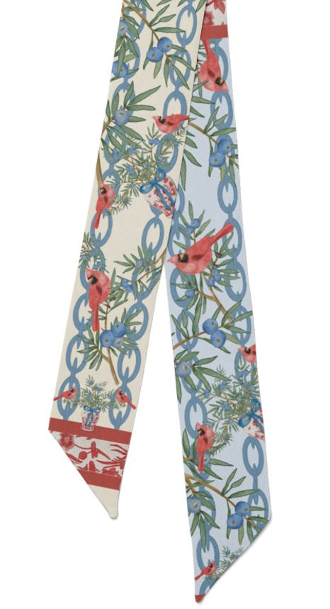 Discover the natural elegance of our Cardinal and Blueberry scarflette scarf, a charming accessory that brings woodland beauty to your everyday style. Featuring vibrant red cardinals perched among lush green foliage and blue berries, all connected by an elegant chain-link pattern, this versatile piece adds a touch of nature-inspired sophistication to any outfit.