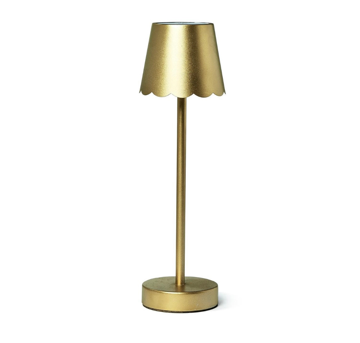 Create the perfect ambiance anywhere with this cordless, portable LED light. A touch button functionality makes it easy to switch between the three different light settings and dimmer function. Features a good metallic finish and scalloped edge shade. Customize further with our scalloped paper shades, available in a variety of prints.