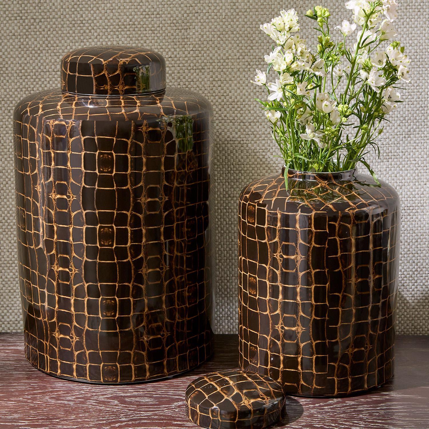 Elevate your space with the timeless elegance of our Tortoise Covered Jars. Crafted from exquisite porcelain, these jars exude sophistication and luxury. Painted in a stunning tortoise pattern, each piece adds a touch of opulence to any room. These jars are a must-have!