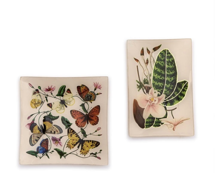 Bring botanicals inside with the Butterfly and Botanical Glass Trinket Tray. Crafted with meticulous attention to detail, each tray features a stunning gold foil backing that adds a touch of glamour to any space. The assorted butterfly and botanical designs bring a whimsical and elegant touch to your home. Use them to display your favorite jewelry, keys, or simply as a charming decorative accent. Handmade with care, these trays are perfect for adding a touch of sophistication to your living space.