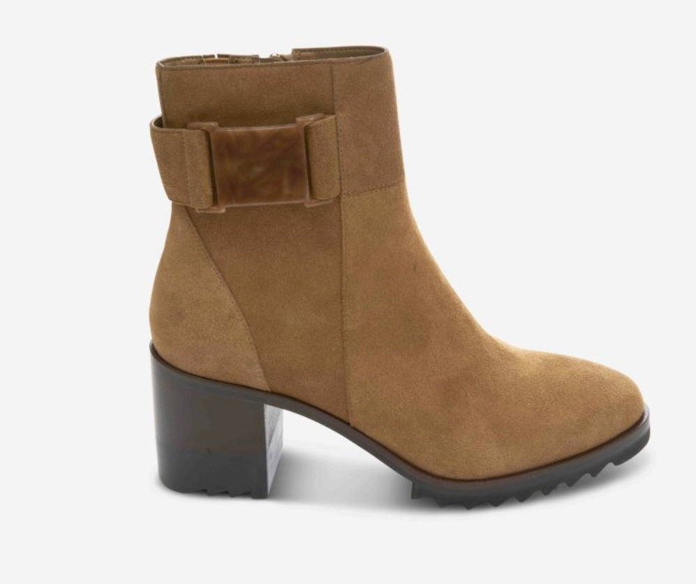 Glossy hardware adds a sophisticated flourish to a water-resistant bootie designed for practicality and comfort. 2.5 inch heel, 6 inch shaft.