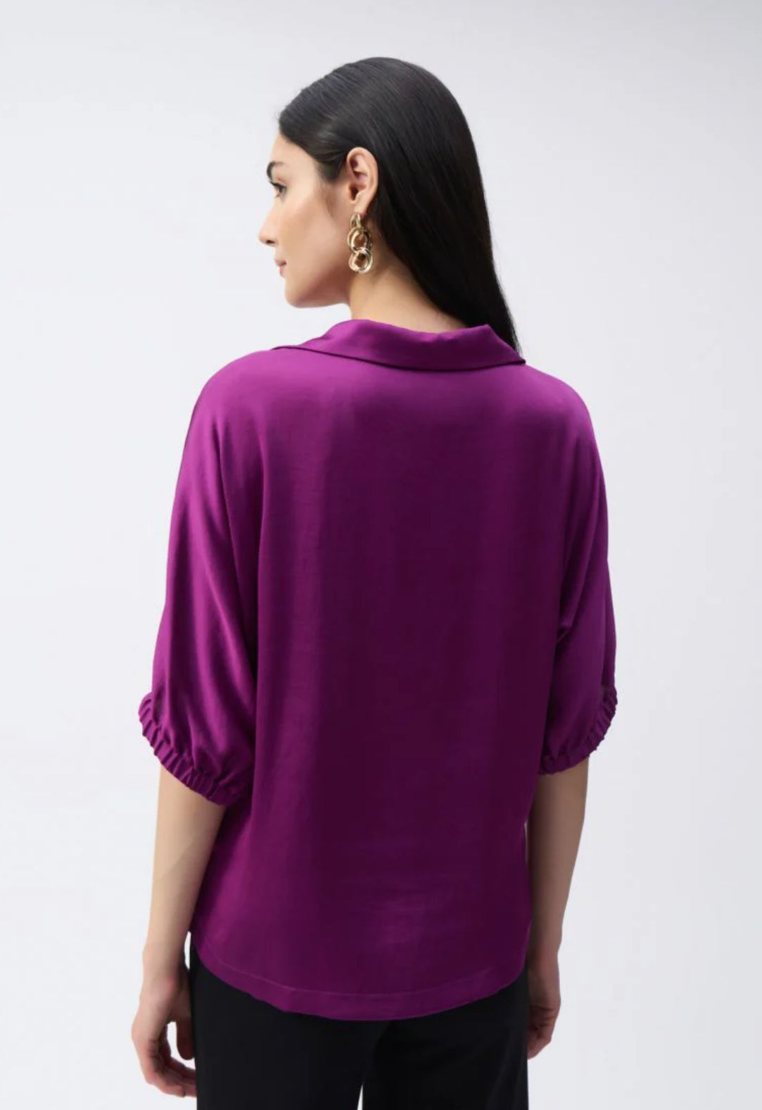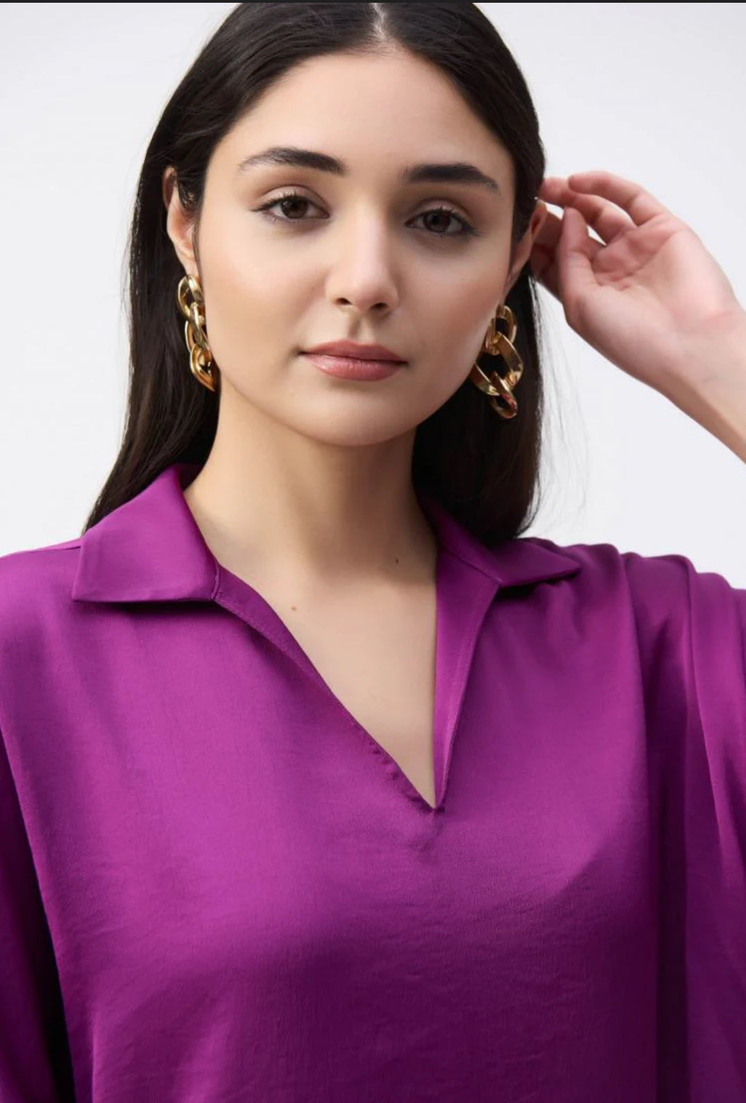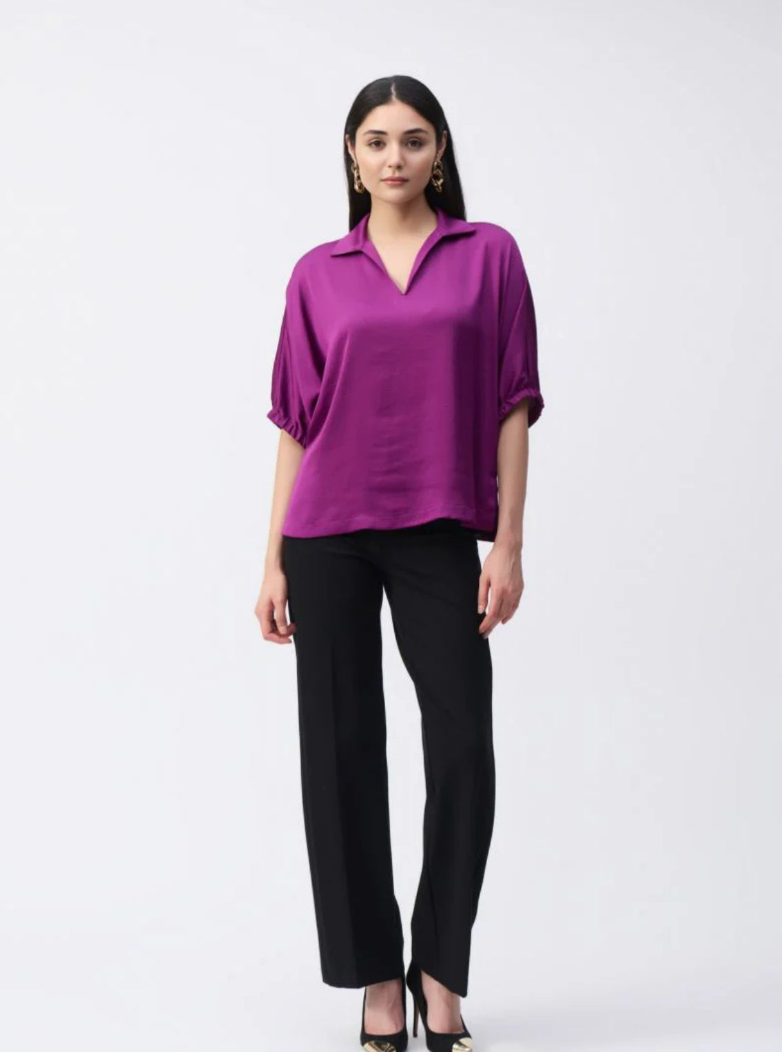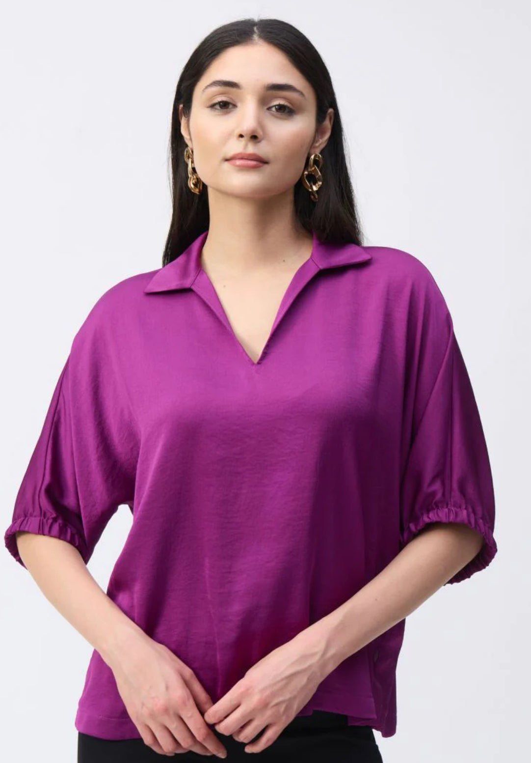 This boxy top exudes modern elegance. The short puff sleeves add playfulness, while the shirt collar lends sophistication. The side slit detail introduces a subtle, yet striking, twist to this stylish design.