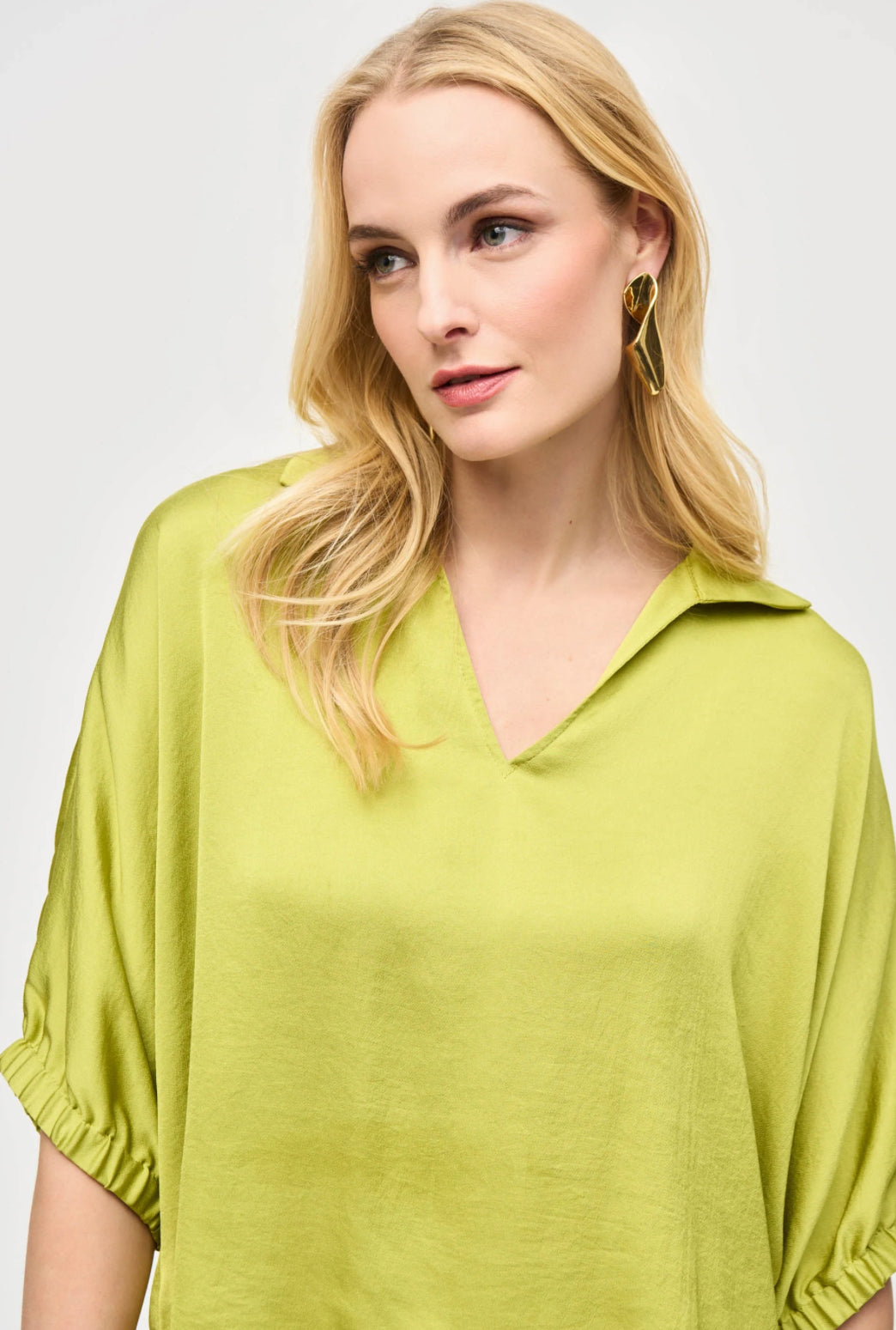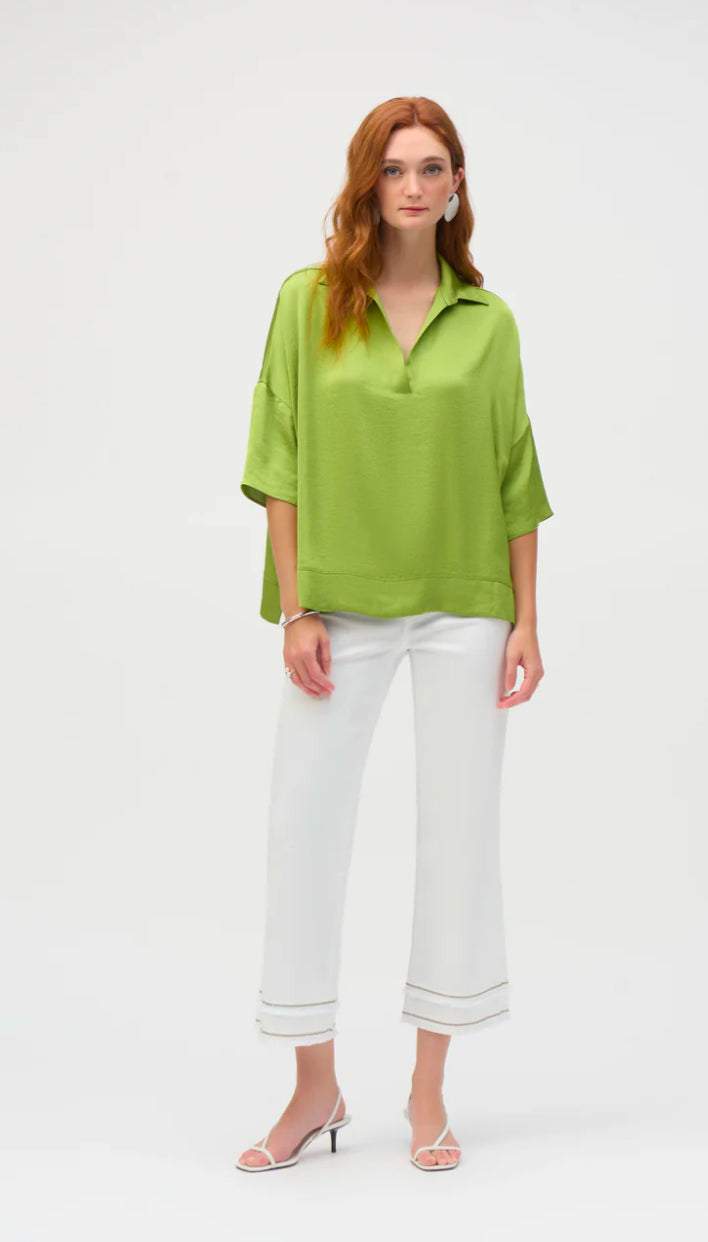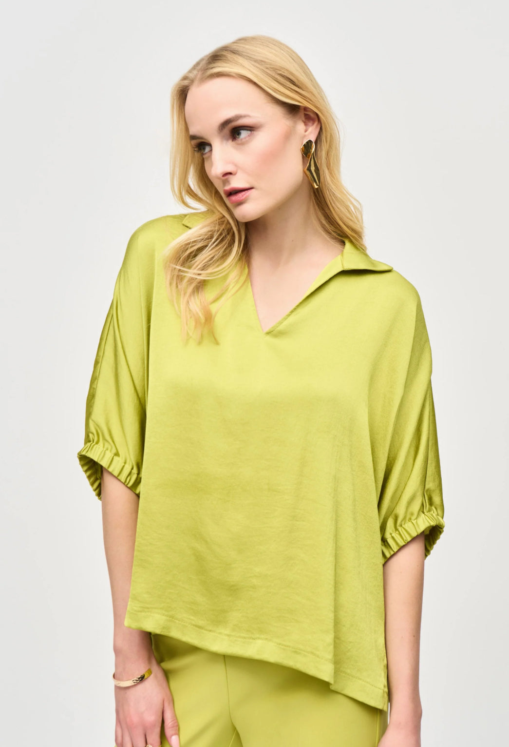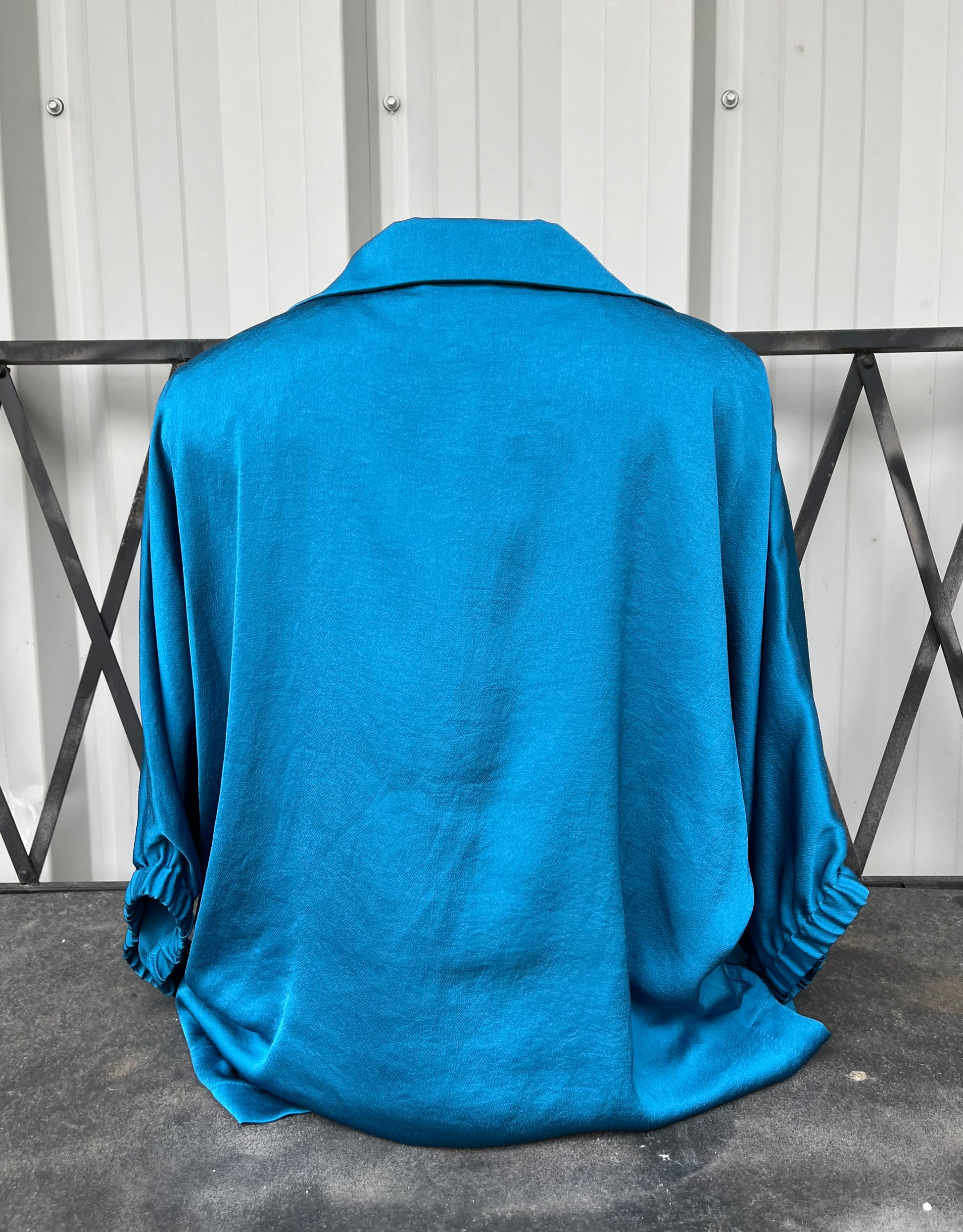 This boxy top exudes modern elegance. The short puff sleeves add playfulness, while the shirt collar lends sophistication. The side slit detail introduces a subtle, yet striking, twist to this stylish design.