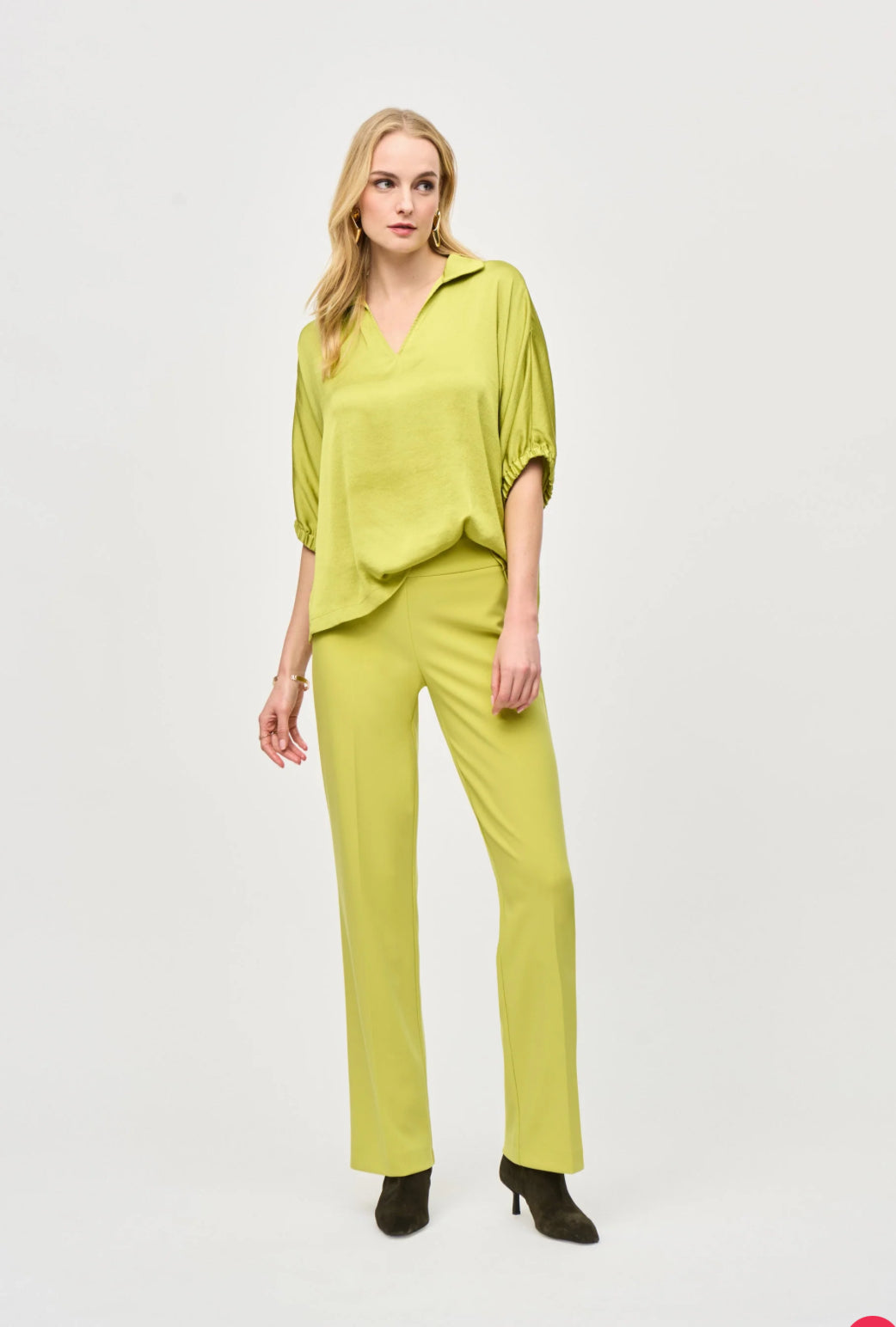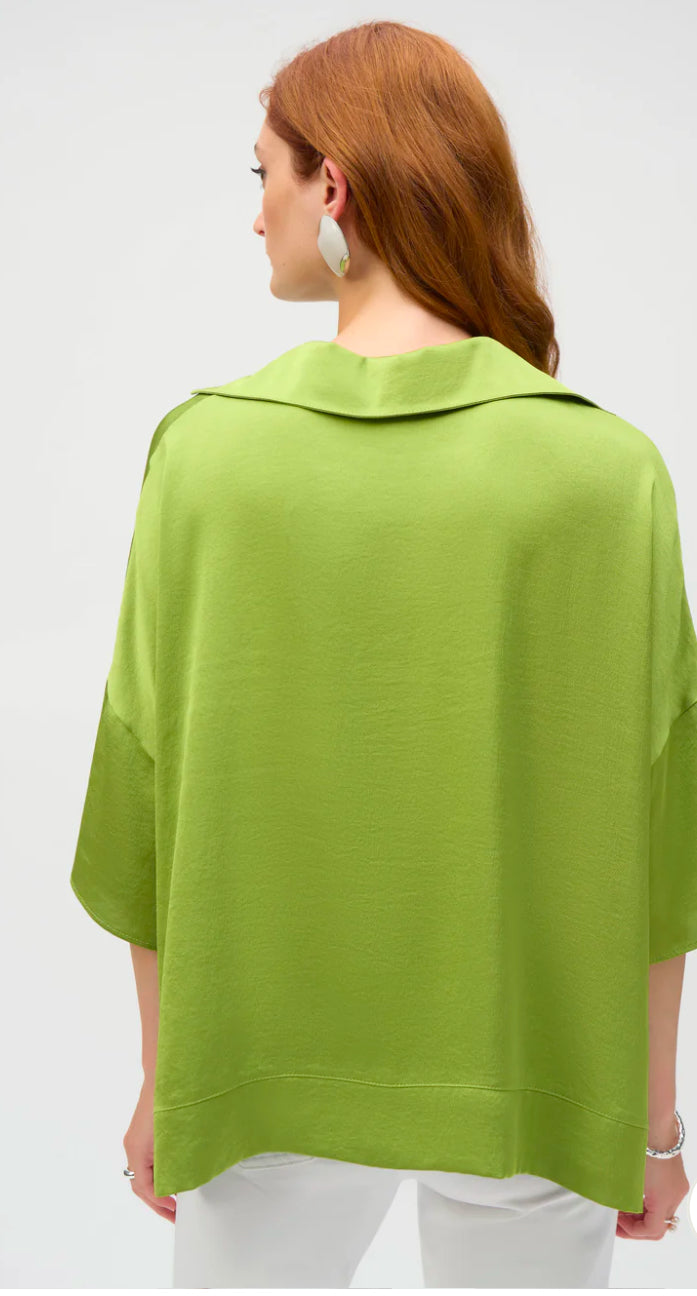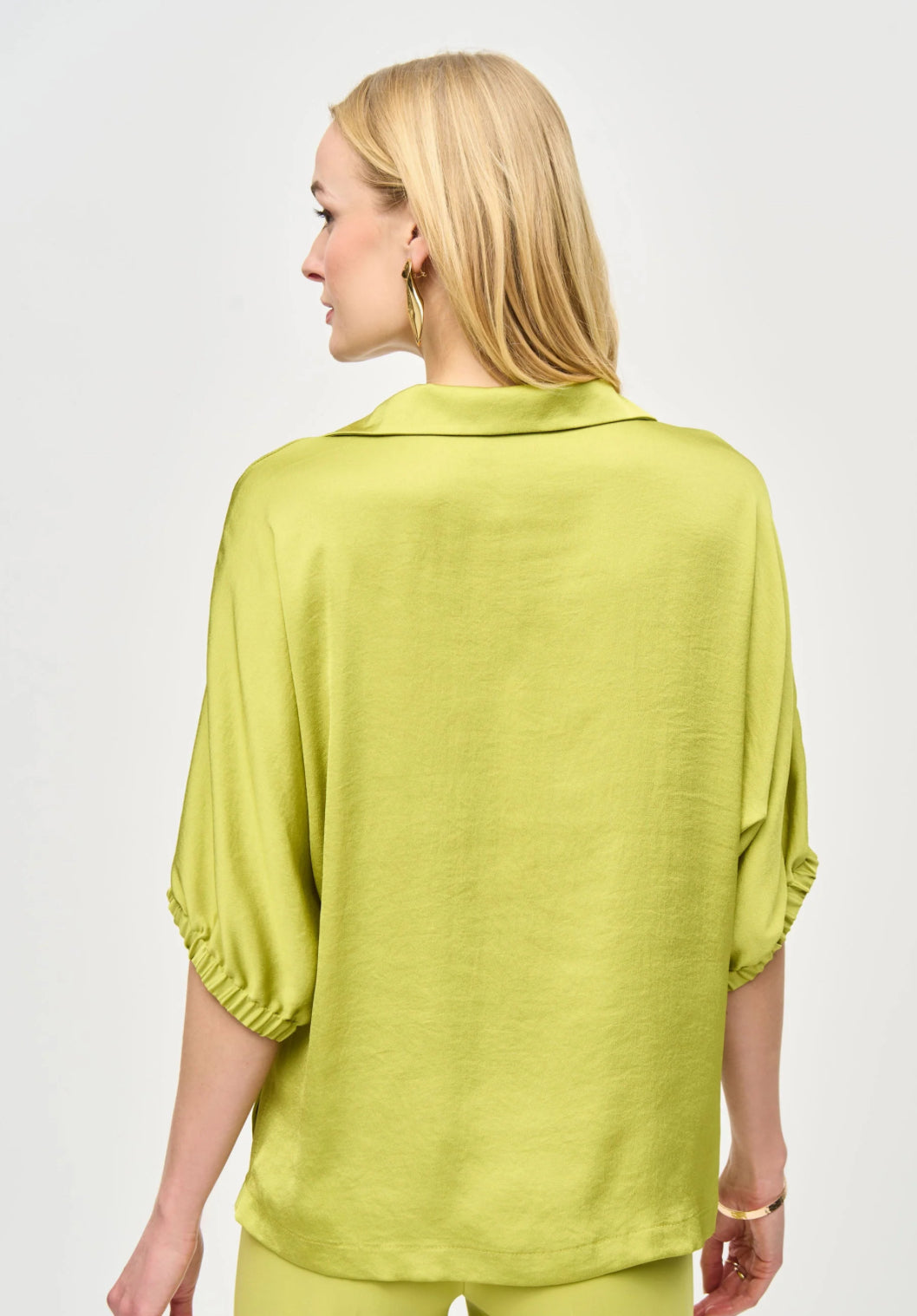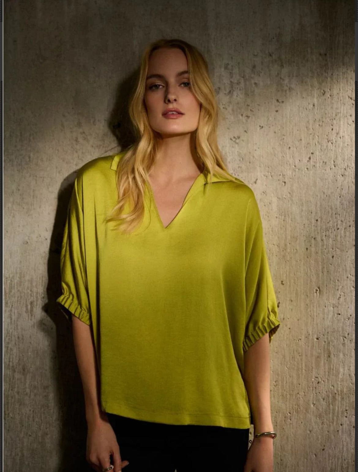 This boxy top exudes modern elegance. The short puff sleeves add playfulness, while the shirt collar lends sophistication. The side slit detail introduces a subtle, yet striking, twist to this stylish design.