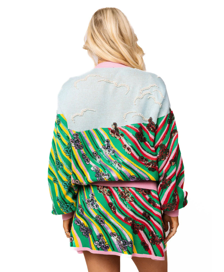 Inspired by the legendary path to the Emerald City, this button-up cardigan brings the magic of Oz to your wardrobe. Featuring a whimsical Yellow Brick Road design and comfy knit feel, it's perfect for fans of the classic tale. Pair with the matching skirt for the full magical look. Slightly oversized for a cozy fit.