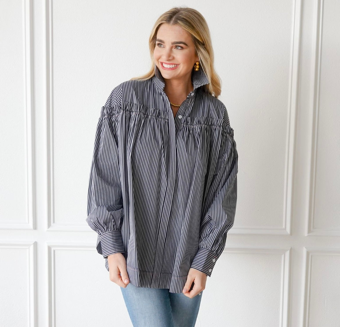 The black Stripe Miriam Top adds a touch of quirky charm to your everyday look. Perfect for any outfit, this button-up shirt features long sleeves and a playful ruffle detail. One Size Fits Most!