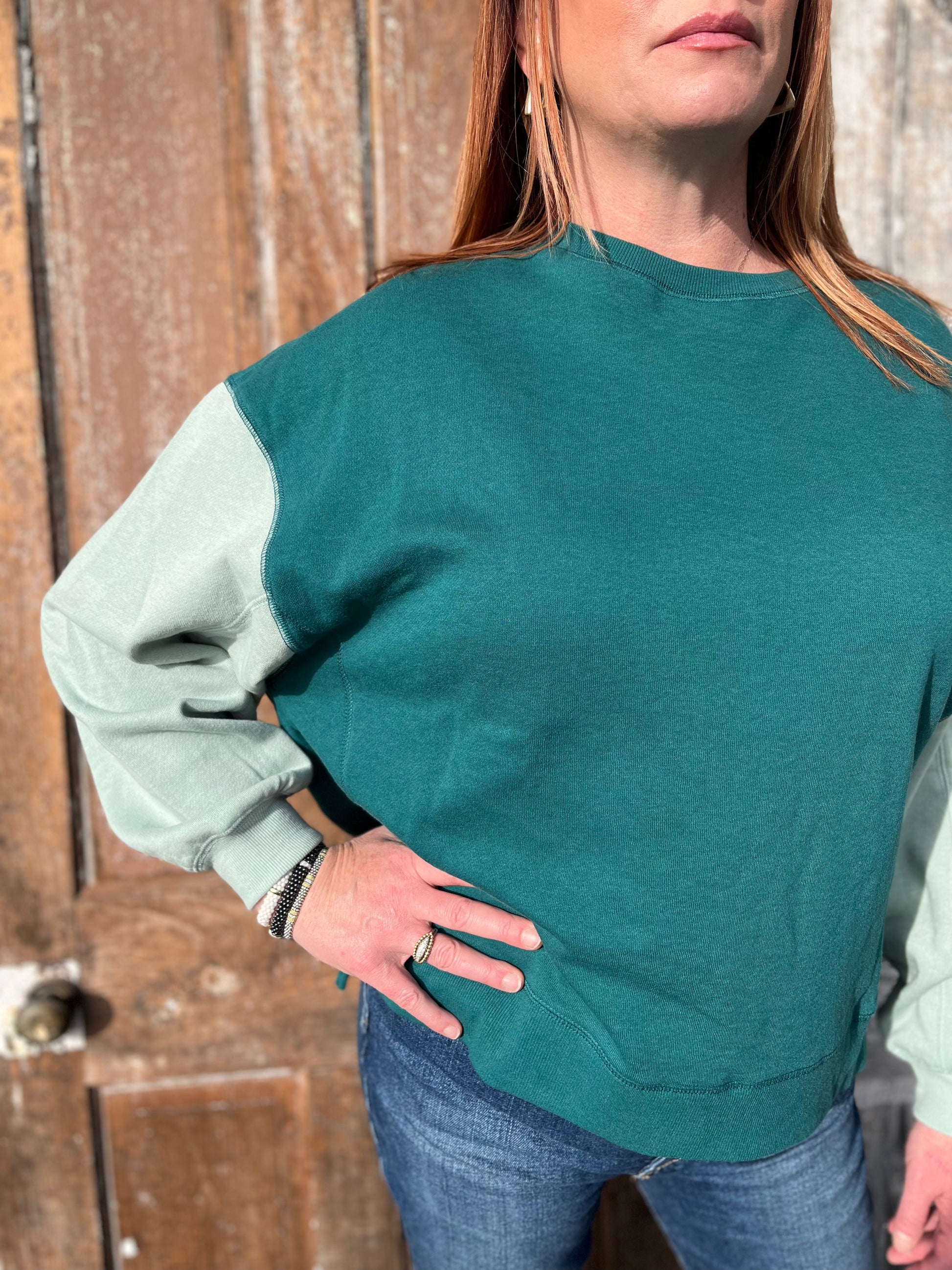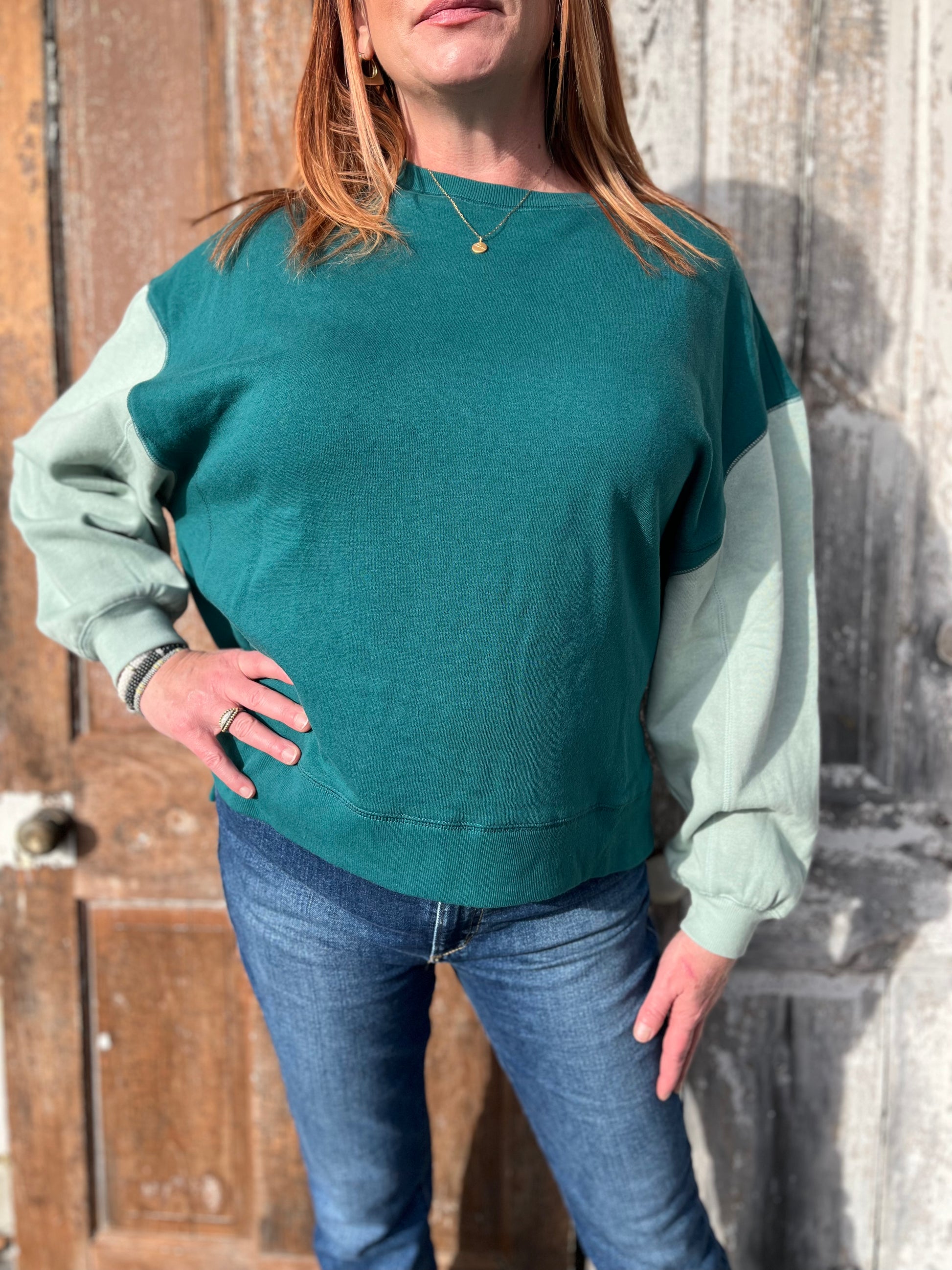 Our Weekender silhouette might look familiar, but this one hits on the oh-so-popular colorblock trend. The Colorblocked Modern Weekender will become your new fave, with its pop of contrasting color at the sleeves. Designed in our soft and cozy fleece fabric, you'll want to live in it all season.