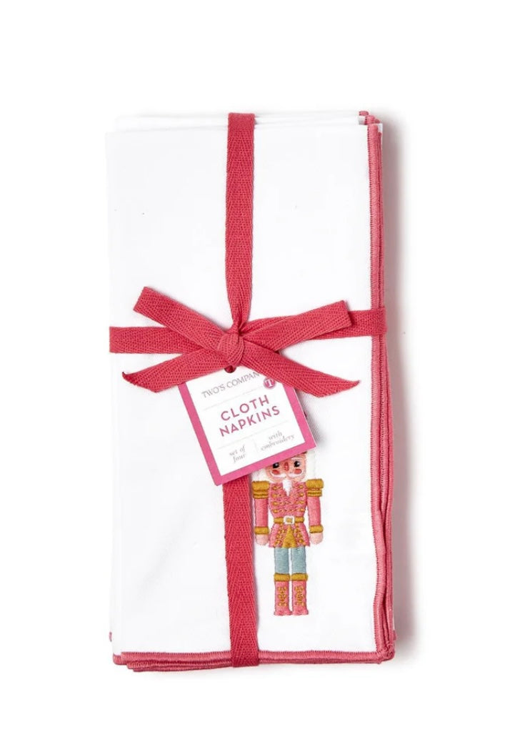 We love the fresh colors in these festive napkins, which are woven from 100% cotton and feature an embroidered nutcracker and pink stitched trim. Packaged beautifully in a set of 4 with a ribbon tie, they make a great holiday gift.