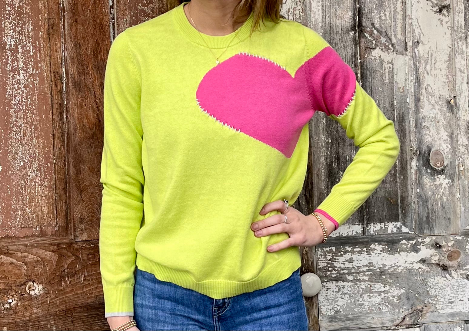 Lime green sweater with pink heart. Stitching around heart to look like patch.