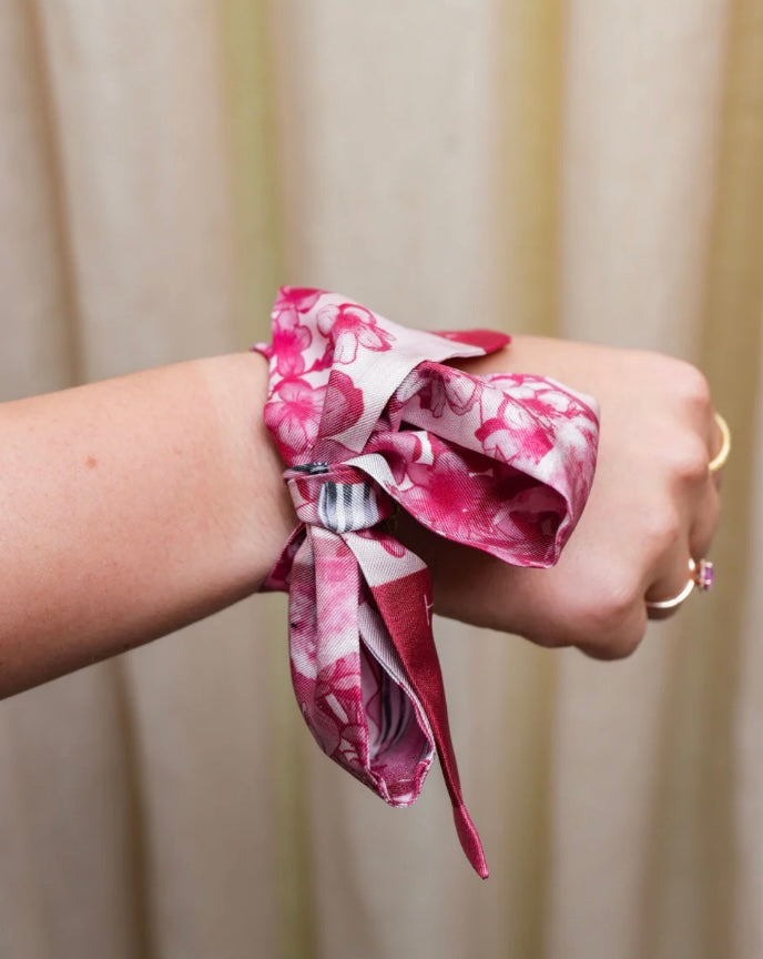 Embrace spirited charm with this delightful scarflette. Crafted with a vibrant floral pattern in shades of pink and red, this versatile accessory pays homage to natural beauty and whimsical wildlife motifs.