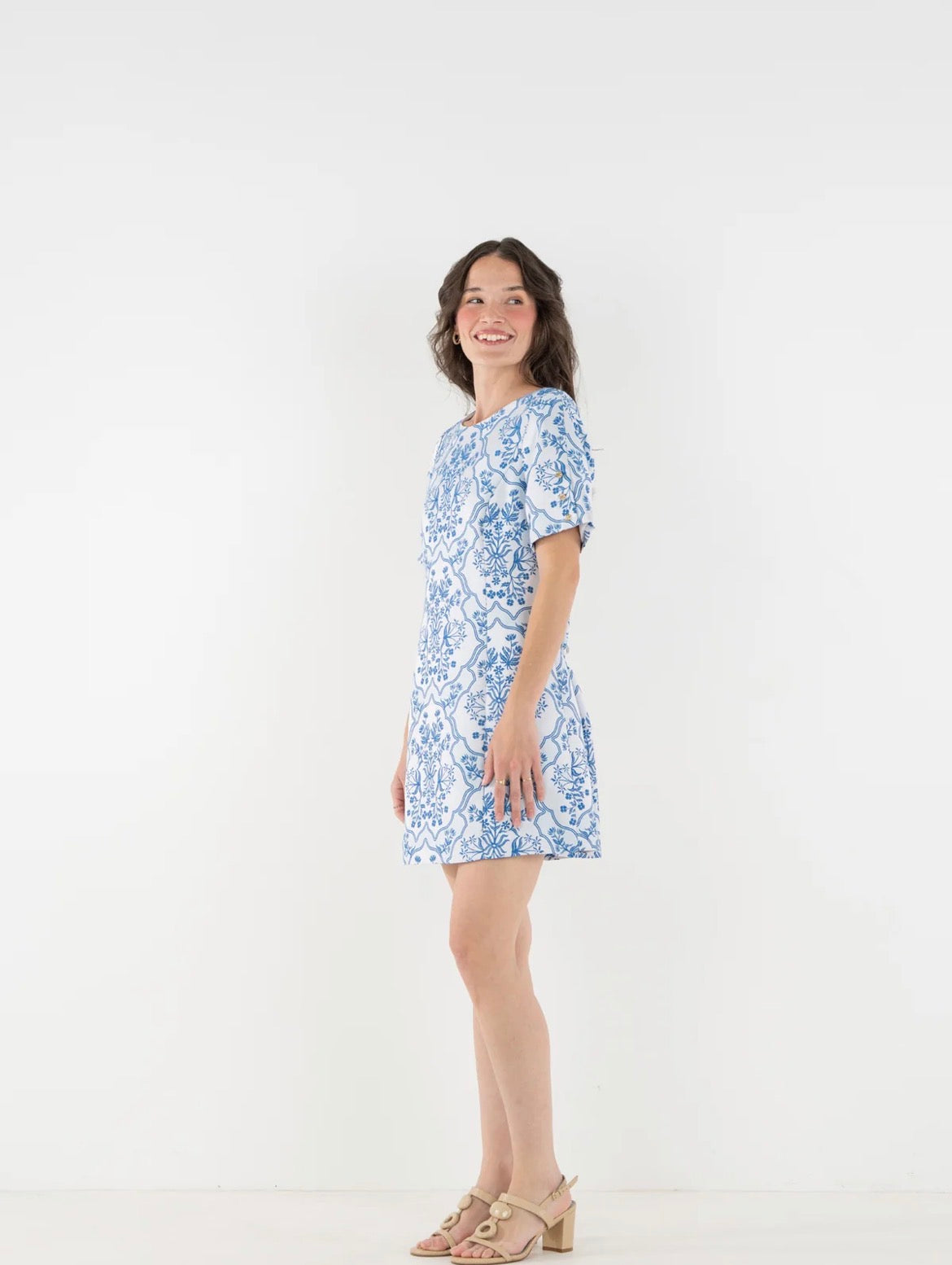 The Royale Shift in Royal Tapestry is a classic silhouette elevated with thoughtful detail. Designed with short sleeves accented by our signature gold buttons and a subtly tailored shape, it offers a flattering fit that feels precise yet approachable. The Royal Tapestry print reimagines classic Indian block florals through a richly woven jacquard, bringing heritage-inspired motifs to life with striking texture and depth.