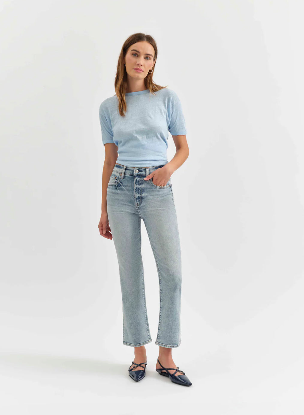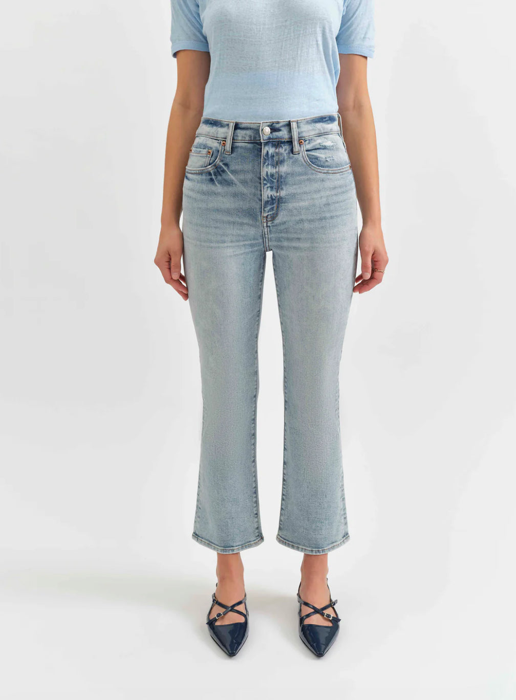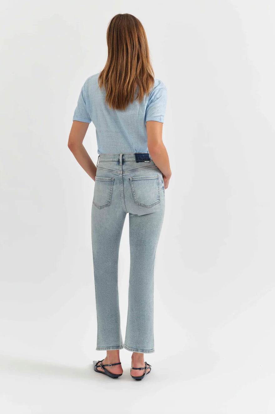 The Shy Girl in Miracle is a flirty high rise cropped kick flare jean in a vintage-inspired light wash featuring dynamic highs and lows. This jean is constructed from our Hug fabric, which is flexible enough to hug your body and heavy enough to cinch you in.