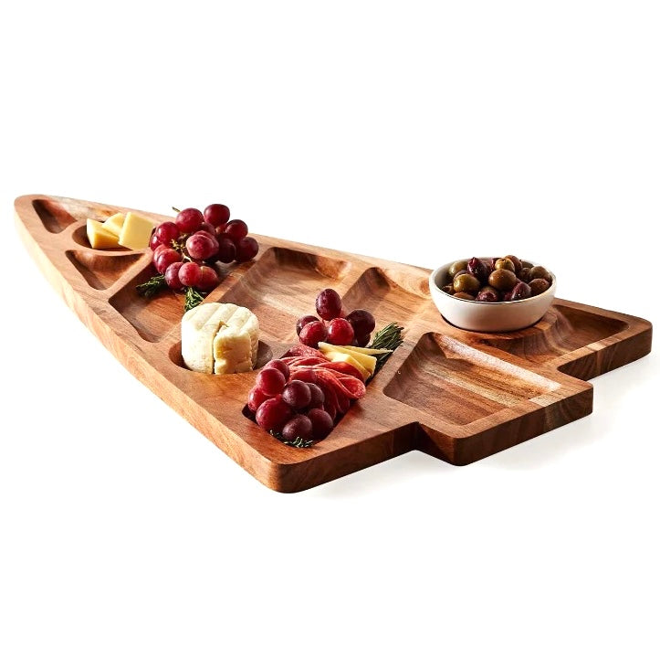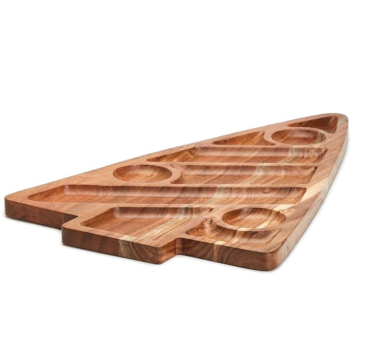 Create the spread of all spreads with our oversized Christmas tree charcuterie board, hand-crafted from beautiful acacia wood. Recessed sections in various sizes and shapes allow for a variety of foods to sit neatly within - from the traditional charcuterie selections, cookies, candy, and desserts, to snacks, hot cocoa and marshmallow bars - there are endless possibilities. It can be flipped over and used as a regular flat board as well.