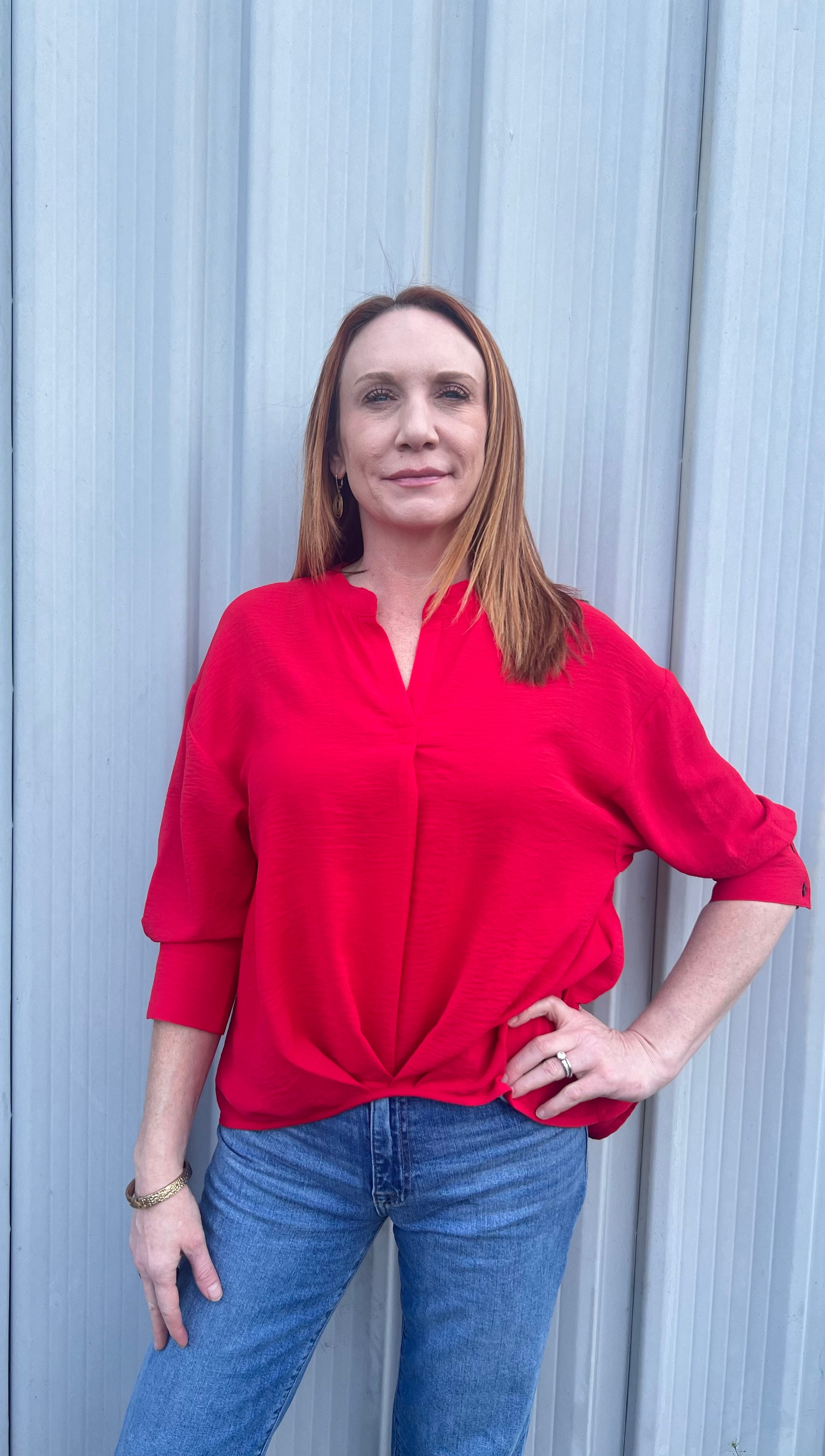 Ivy Jane top. Twisting at front hem. V neck. 3/4 sleeve. Hunter green or Red in color.