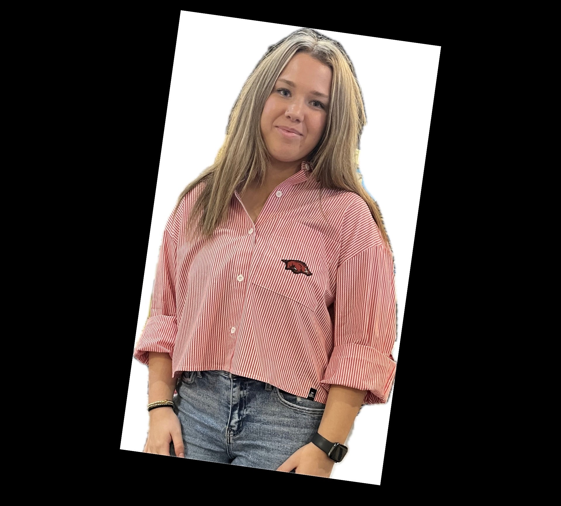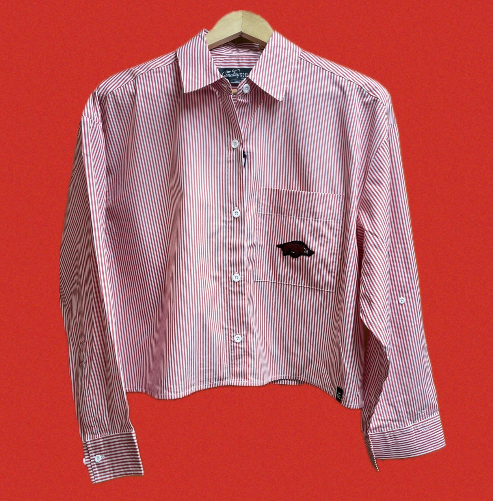 Red & white striped button-front top. Long sleeve. Crop design. 100% cotton.