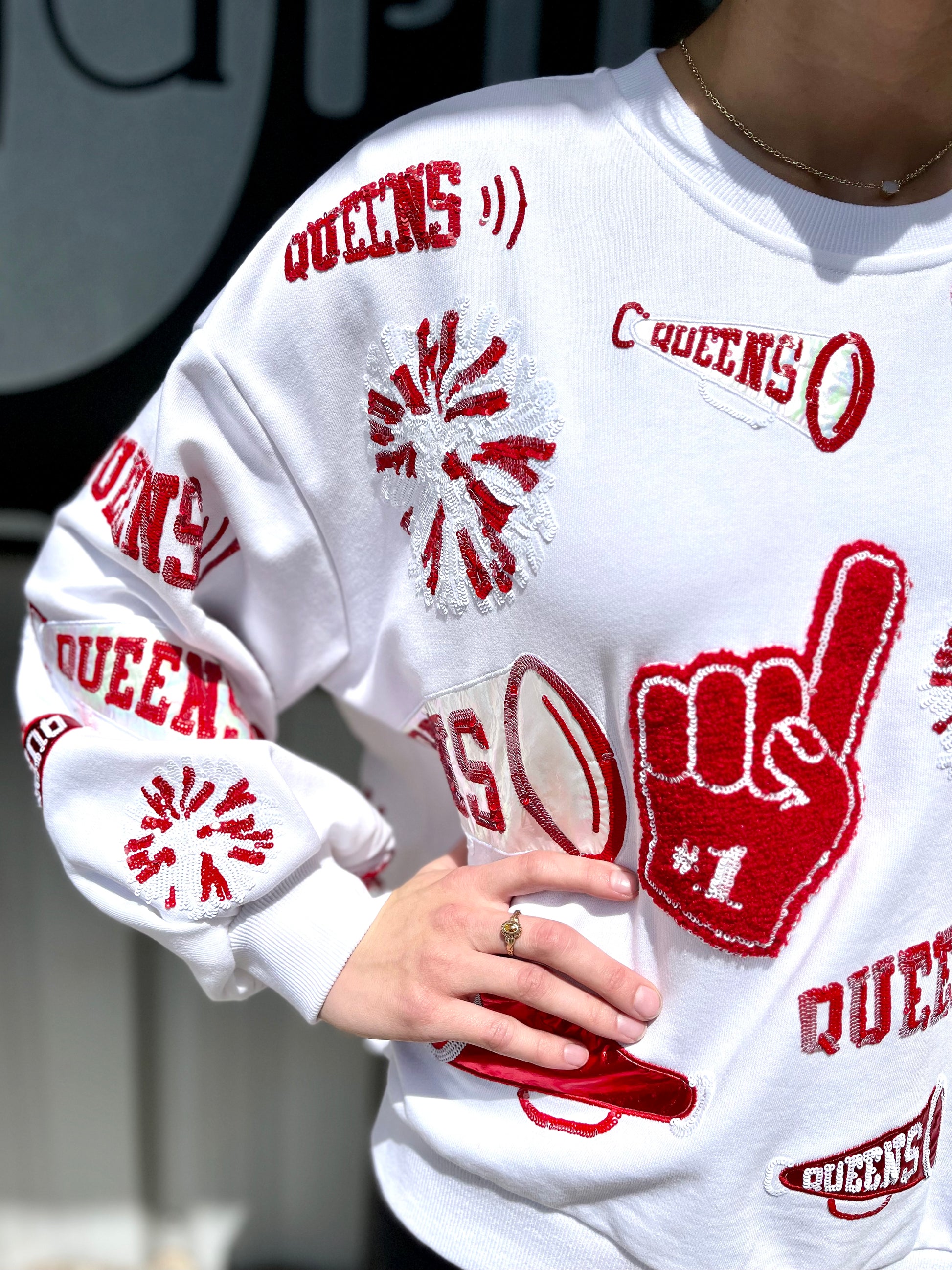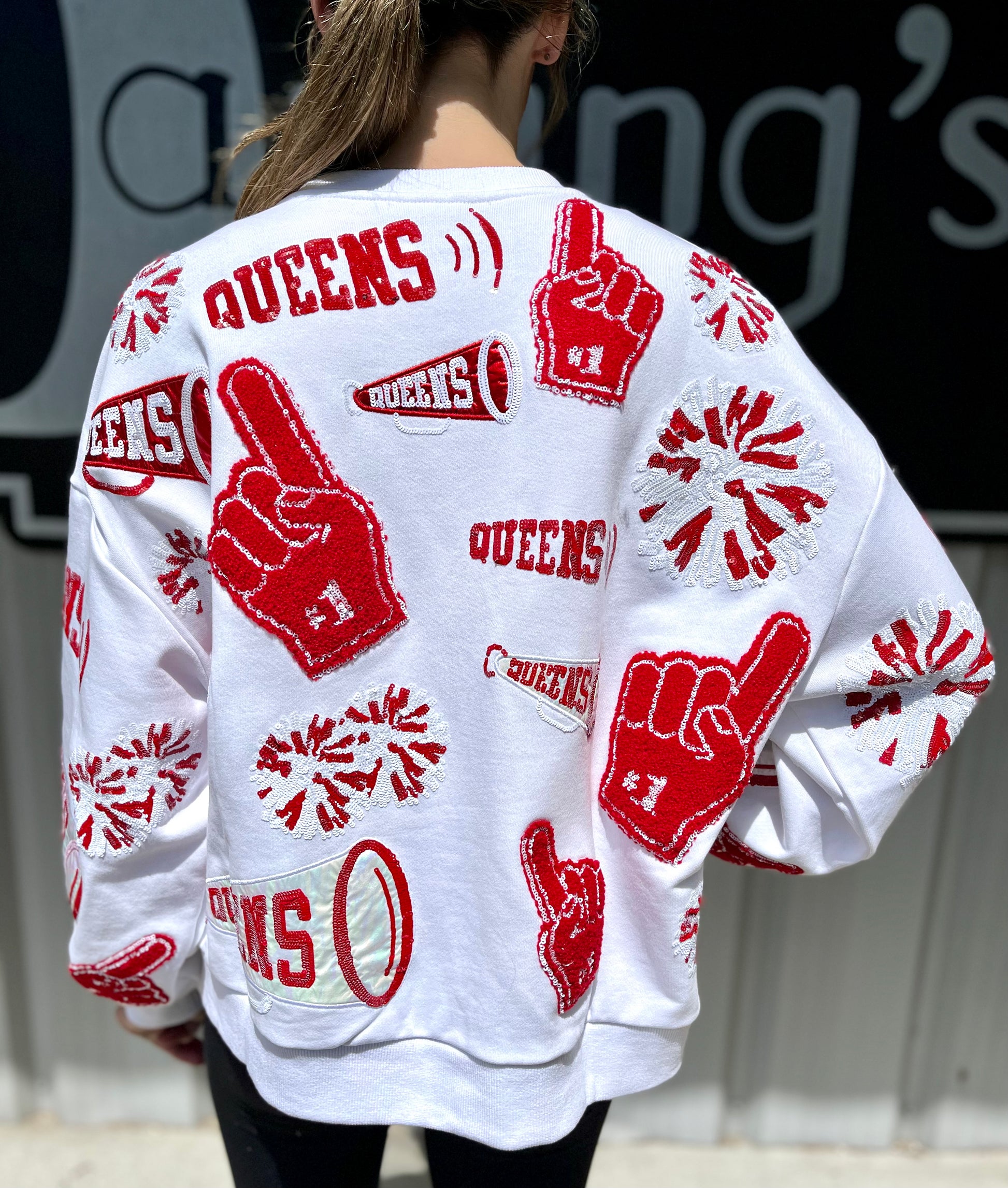 White sweatshirt with crimson and white sequin cheer icons all over.